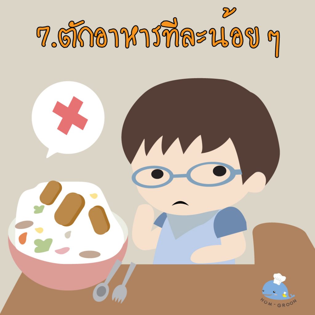 การตักอาหารครั้งละน้อยๆ แล้วค่อยเติมเมื่อเด็กรับประทานหมด จะดีกว่าการตักอาหารครั้งละมากๆแล้วบังคับให้เด็กกินจนหมด เพราะจะทำให้เด็กรู้สึกกดดัน อีกทั้งหากเด็กรับประทานอาหารเหลือบ่อยๆ เขาก็จะเคยชินกับการเหลืออาหารทิ้งไว้ในจาน