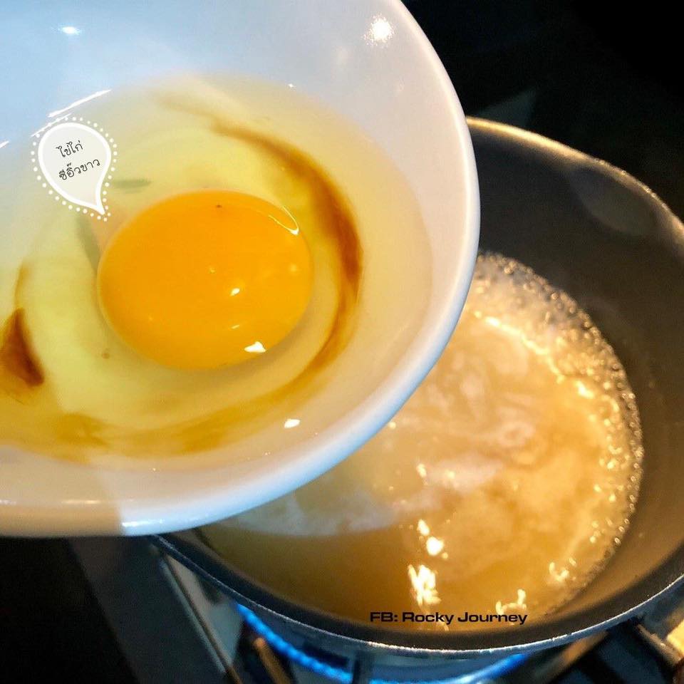 3.ตีไข่ไก่ 1 ฟอง กับซีอิ๊วขาว แล้วเทลงไปในหม้อต้มโดยไม่ต้องคนจะได้ไข่นุ่มเป็นชิ้นๆน่าทาน